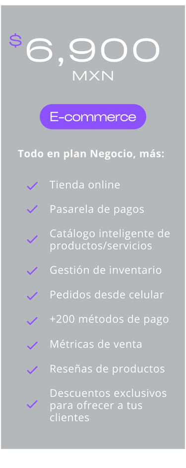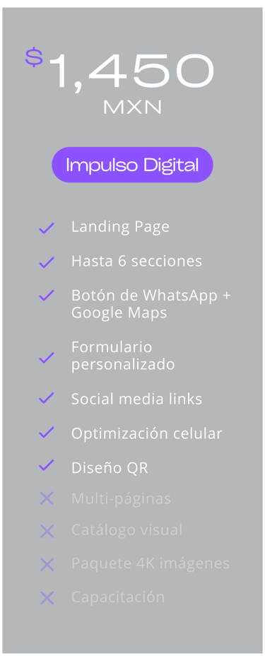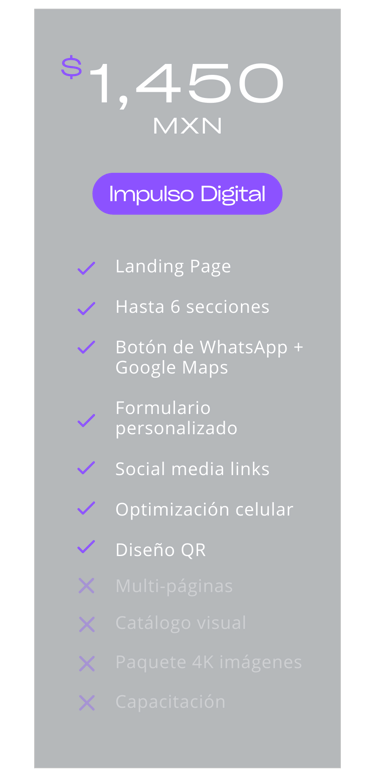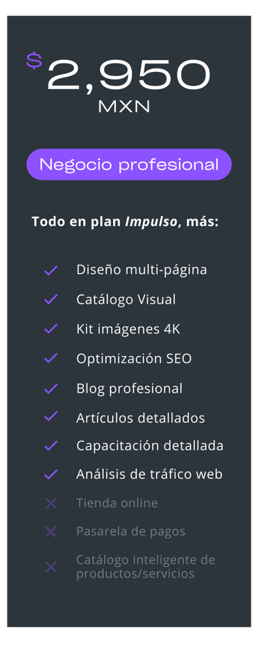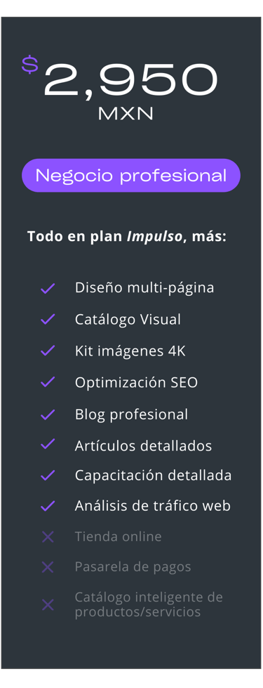 Más que un costo, es la inversión más rentable para tu negocio: desde $1,450 MXN (el equivalente a un café al día por un mes). Lo mejor? Solo es necesario dar la mitad, liquidas hasta que tengas tu página web lista y publicada.